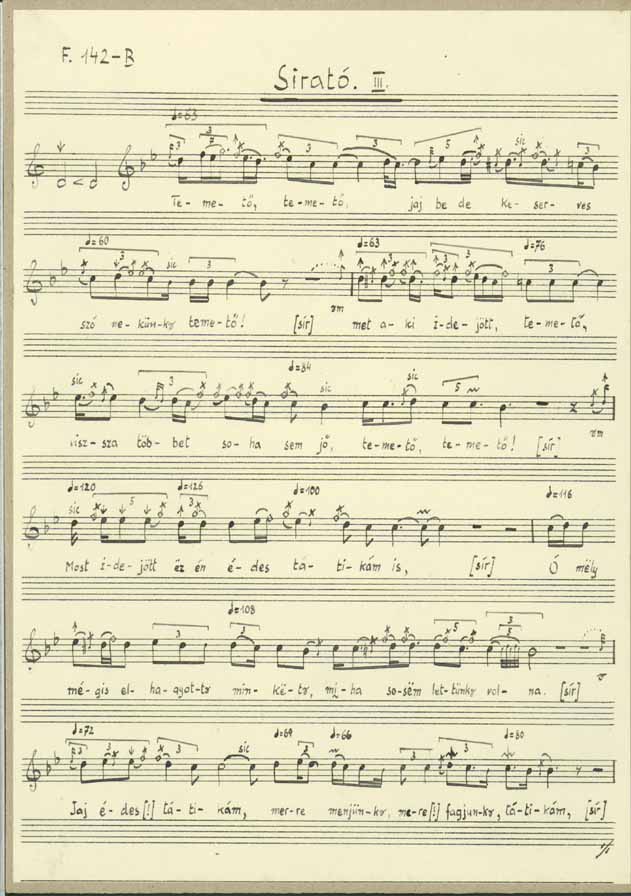 Temető, temető, jaj be de keserves szó nekünk, temető ... met aki ide jött, temető, vissza többet soha sem jó, temető, temető ... Most ide jött az én édes tátikám is ... Ó mely mégis elhagyott minket, mintha sosem lettünk volna ... Jaj édes tátikám, merre menjünk és merre fogjunk, tátikám ... ha mi még egyszer összetalálkozunk s egy csokrecskába összegyűljünk tátikám ... Mert úgy elcsorbult a csokrunk, hogy az asztalnál is mindig hiányzik ... Édes tátikám, jöjjön el álmunkba, tanítgasson meg münket ... hogy bajakba ne essünk, mert más senki sincsen, aki megtanítson.
