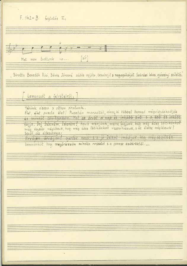 (Énekelve): Isten fizesse, tátikám, hogy ekkarára felnevelt, tűztől, víztől megőrzöttek ... s minden rossztól megmentettek, hogy semmi bajba mostanig nem estünk ... s maradjon békével az Isten nyugodalmába, édes tátikám ... Megbocsássanak, mennyit vétettünk, mert tudom, hogy sokat vétettünk ... Mert nem tudtunk va ... Siratta Benedek Rózi, Benke Jánosné 'z édesaptyát, testvéreit, nagyapókáját. Szárászi lakos, gyószényi születés."