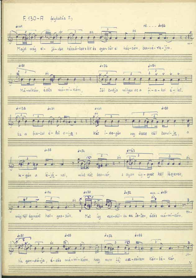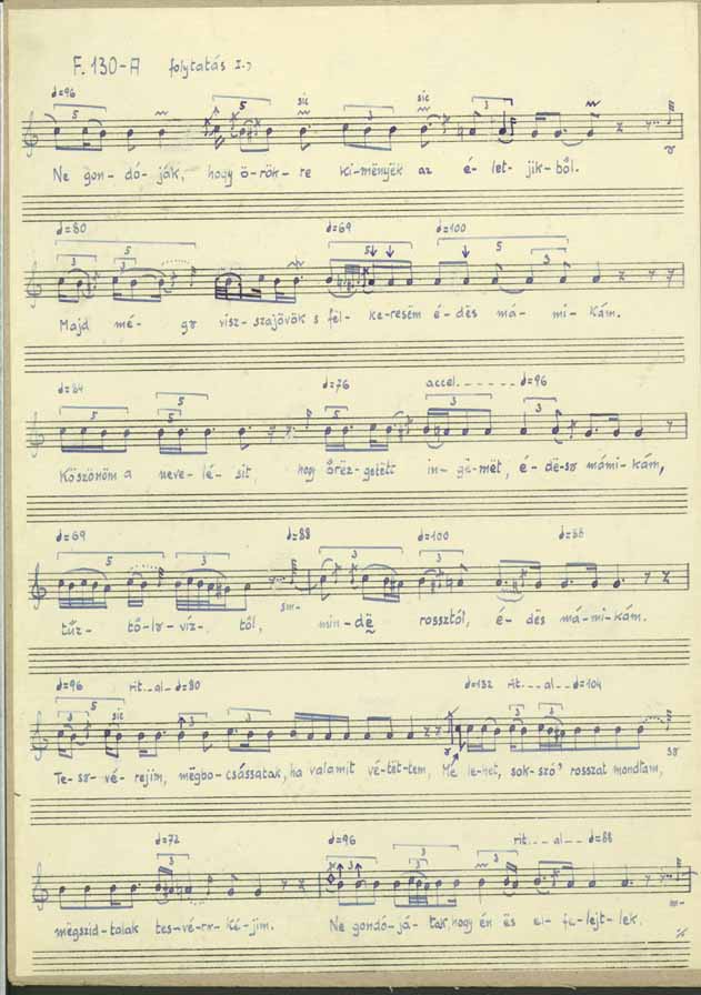 "Mámikám, édes mámikám, maradjon békével, édes mámikám, mert nekem lábaim indulnak, ajtók kapuk nyílnak, anyám. Isten fizesse meg, hogy ekkorára felnevelt, tűztől, víztől őrzött, gyenge vízben feresztett, mámikám. – Arra kérem, már se felejtsen el, mámikám, mer én se felejtem el. Mámikám, édes mámikám, s tátikám, édes tátikám, mér nem jő haza. Jusson eszibe, két esztendős mikor árván maradtam, tátikám. Isten tudja mámikám, hogy nevelgetett egyedül. Mindenkinek édesapja vót, csak én voltam árva, tátikám. Árvának születtem, tátikám, s árván halok meg. Isten tudja, hogy nőttem fel apa nélkül. De köszönöm édes anyámnak, hogy felnevelgetett s felruházott, s arra kérem édes mámikám, hogy megbocsásson, ha valamit vétettem, ha sokszor a szót visszamondtam s nem kellett volna, mámikám."