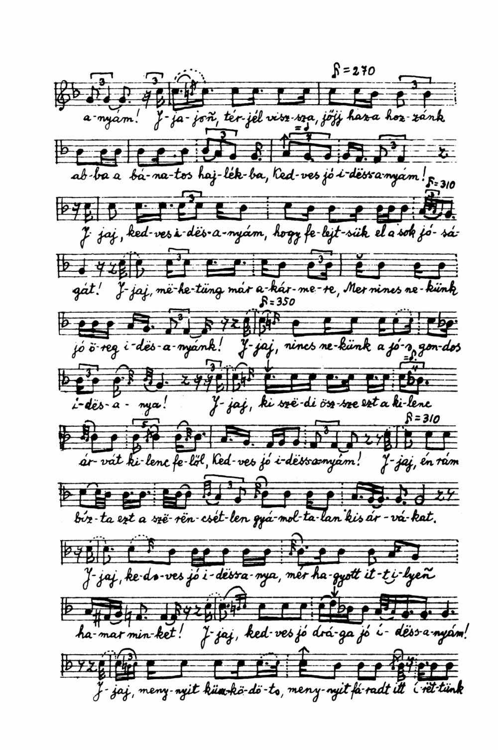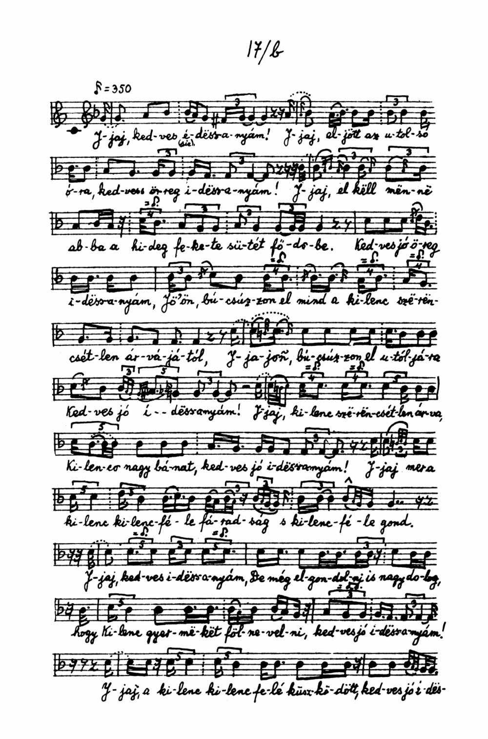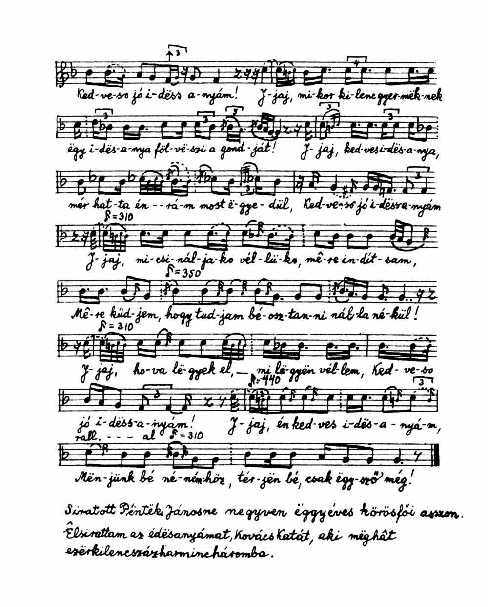 Jaj kedves édesanyám ... jaj eljött az utolsó óra kedves öreg édesanyám ... jaj el kell menni abba a hideg fekete sötét földbe ... kedves jó öreg édesanyám jöjjön, búcsuzzon el mind a kilenc szerencsétlen árvájától ... jöjjön búcsúzzon el utóljára kedves jó édesanyám ... jaj kilenc szerencsétlen árva kilenc nagy bánat kedves jó édesanyám ... jaj mer a kilenc kilencféle fáradtság s kilencféle gond ... jaj kedves édesanyám de még elgondolni is nagy dolog, hogy kilenc gyermeket fölnevelni, kedves jó édesanyám ... jaj a kilenc kilencfelé küszködött kedves jó édesanyám ... jöjjön térjen vissza jöjj haza hozzánk abba bánatos hajlékba kedves jó édesanyám ... jaj kedves édesanyám hogy felejtsük el a sok jóságát ... jaj mehetünk már akármerre me nincs nekünk jó öreg édesanyánk ... jaj nincs nekünk a jaj gondos édesanyánk ... jaj ki szedi össze ezt a kilenc árvát kilencfelől kedves jó édesanyám ... jaj énrám bízta ezt a szöröncsétlen gyámoltalan kis árvákat ... jaj kedves jó idös anya mér hagyott itt ilyen hamar minket ... jaj kedves jó drága jó édesanyám ... jaj mennyit küszködött, mennyit fáradt itt érettünk kedves jó édesanyám... jaj mikor kilenc gyermeknek egy édesanya fölveszi a gondját ... jaj kedves édesanyám mér hagyta énrám most egyedül kedves jó édesanyám...jaj mit csináljak véllük, merre indítsam, merre küldjem, hogy tudjam béosztani nálla nélkül ... jaj hova legyek el mi legyen véllem kedves jó édesanyám ... jöjjön kedves édesanyám menjünk be nénémhöz, térjen bé csak egysze’ még ...