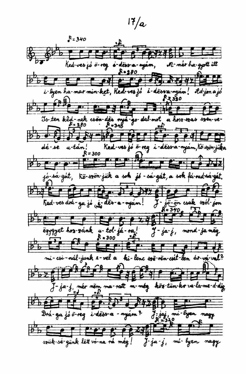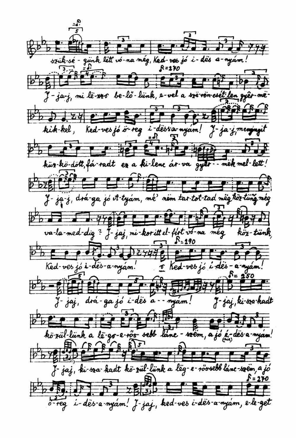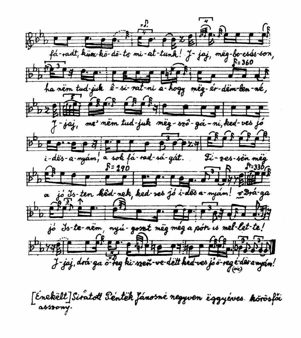 Kedves jó öreg édesanyám ... mér hagyott itt ilyen hamar minket kedves jó édesanyám ... adjon a jó Isten keednek csendes nyúgodalmot a hosszas szenvedése után ... kedves jó öreg édesanyám köszönjük a jóságát, köszönjük a sok jóságát, a sok fáradtságát kedves drága jó édesanyám ... jöjjön csak szóljon egyet hozzánk utóljára ... jaj mondja meg mit csináljunk evvel a kilenc szerencsétlen árvával ... jaj mér nem maradt még köztünk valameddig drága jó öreg édesanyám ... jaj milyen nagy szükségünk lett vóna rá még... jaj milyen nagy szükségünk lett vóna még kedves jó édesanyám... jaj mi lesz belőlünk evvel a szerencsétlen gyermekekkel ... kedves jó öreg édesanyám ... jaj mennyit küszködött, fáradt ez a kilenc árva gyermek mellett ... jaj drága jó Atyám mé' nem tartottad meg köztünk még valameddig ... jaj mikor itt elfért vóna még köztünk kedves jó édesanyám ...kedves jó édesanyám ... jaj drága jó édesanyám jaj kiszakadt közüllünk a legerősebb láncszem a jó édesanyám... jaj kiszakadt közüllünk a legerősebb láncszem a jó öreg édesanyám...jaj kedves édesanyám eleget fáradt, küszködött miattunk ... jaj megbocsásson ha nem tudjuk elsiratni ahogy megérdemlenné ... jaj me’ nem tudjuk megszolgálni kedves jó édesanyám a sok fáradtságát ... fizessen meg a jó Isten keednek kedves jó édesanyám ... drága jó Istenem nyúgoszd meg még a port is mellette ... jaj drága öreg kiszenvedett kedves jó öreg édesanyám ...