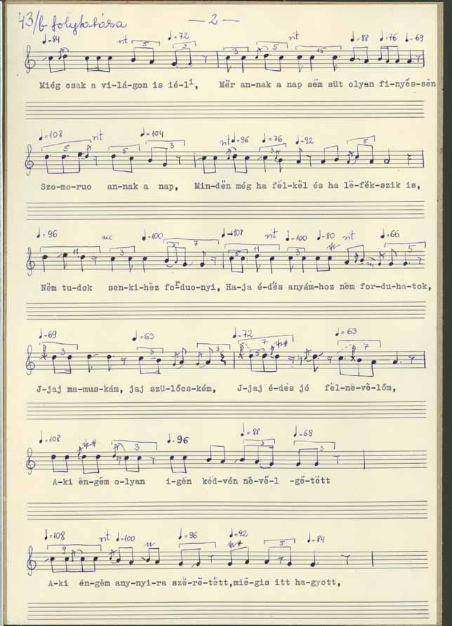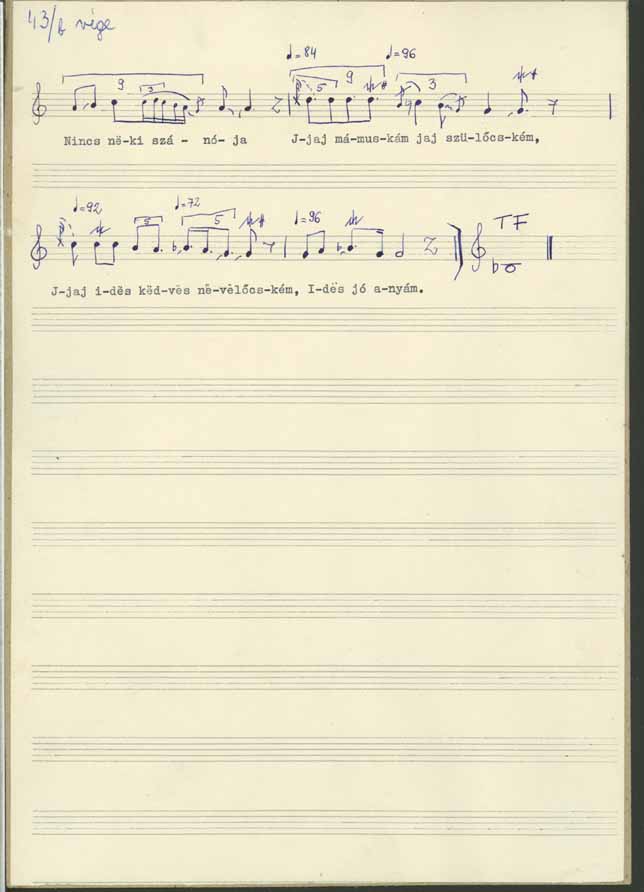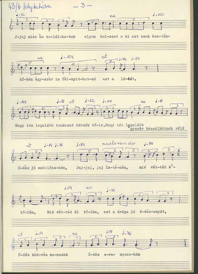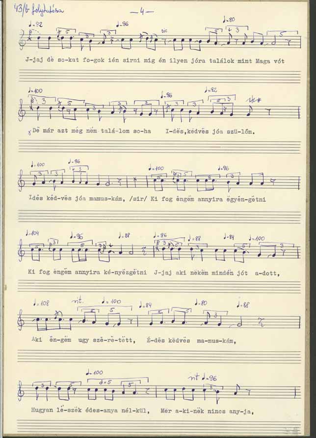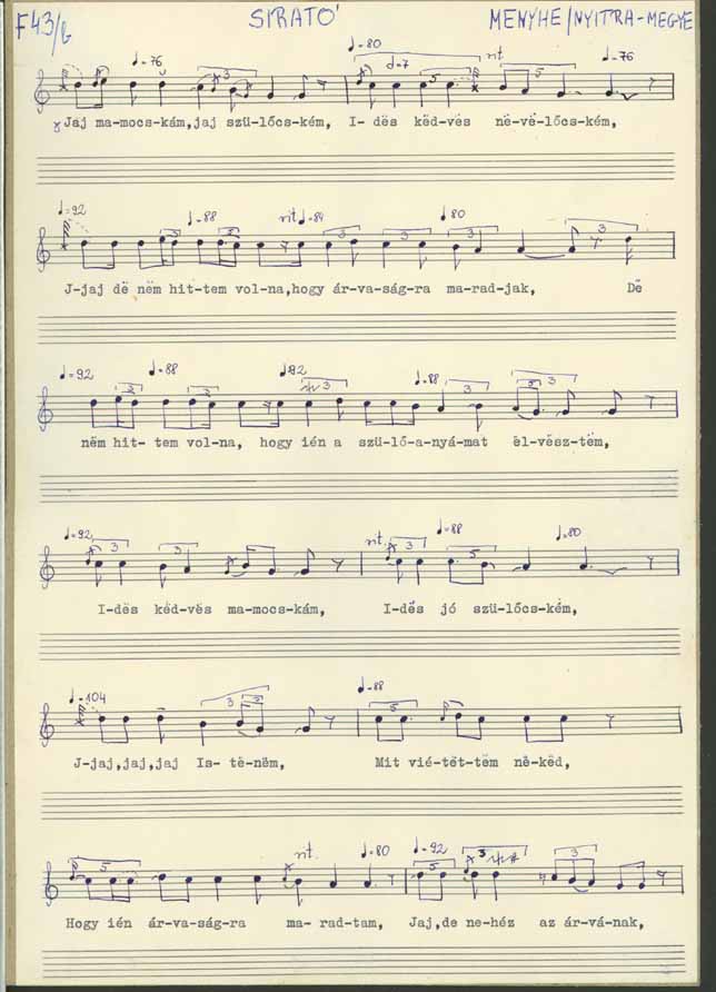 Jaj mamuskám jaj szülőcském édes kedves nevelőcském ... Jaj de nem hittem volna hogy árvaságra maradjak ... de nem hittem volna hogy én a szülő anyámat elvesztem ... édes kedves mamuskám, édes jó szülőcském ... jaj mit vétettem neked, hogy ilyen árvaságra maradtam... jaj be nehéz az árvának még csak a világonn is élni, mer annak a nap sem süt olyan fényesen ... szomorú annak a nap ... minden ... még ha felköl is, ha lefekszik is ... Nem tudok senkihez fordulni, ha ja édesanyámhoz nem fordulhatok ... Jaj mamuskám jaj szülőcském, jaj édes jó felnevelőm, aki engem olyan [... ] kedvén nevelgetett, aki engem annyira szeretett ... mégis itt hagyott ... ... Jaj mié nem találhatok oljan kulcsot aki csak esztendőbe egyszer is felnyithatná azt a ládát ... hogy én legalább tanácsot kérnék tőle, hogy én legalább egyszer beszélhetnék vele, édes jó szülő szülőm ... Jaj, jaj, jaj, Istenem, mér vetted el tőlem, mér vetted el tőlem ezt a drága jó édes anyát ... édes kedves mamuskám, édes aranyocskám ... Ja be sokat fogok én [ ... ] ki oljan jóra találok mint maga vót, de már azt meg nem találom soha, édes kedves jó szülőm, édes kedves jó mamuskám ... ki fog engem annyira egyengetni, ki fog engem annyira kényezgetni ... jaj aki nekem minden jót adott, aki engem úgy szeretett, édes kedves mamuskám ... Hogyan leszek én egy anya nékül, mer akinek nincs anyja nincs neki szánója... Jaj mamuskám, jaj szülőcském, jaj édes kedves nevelőcském, édes jó anyám.