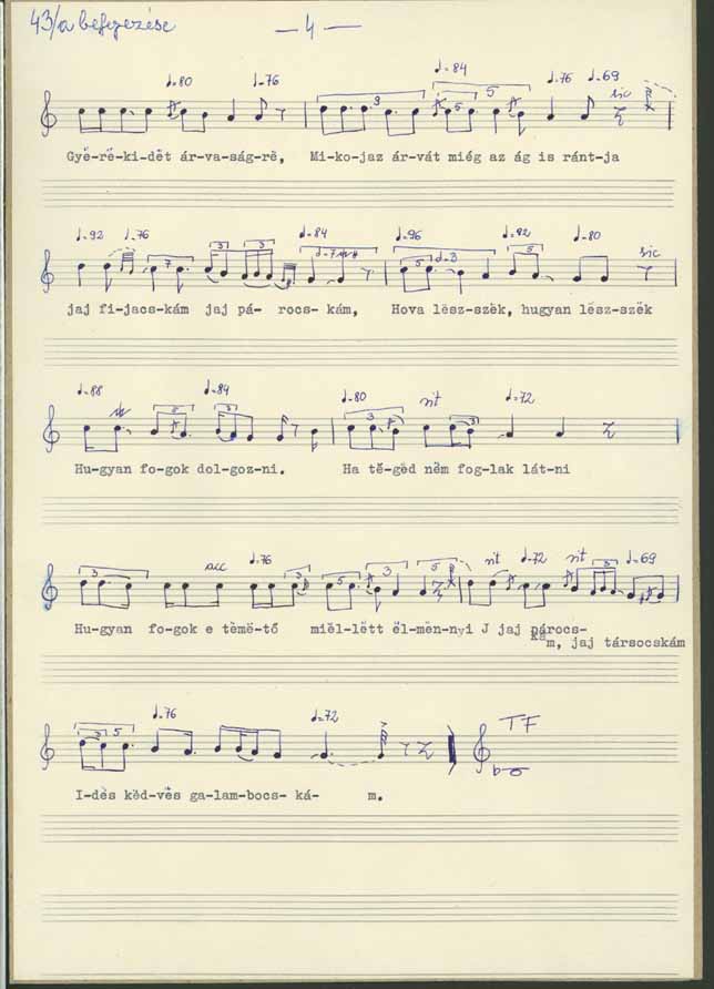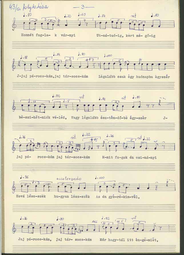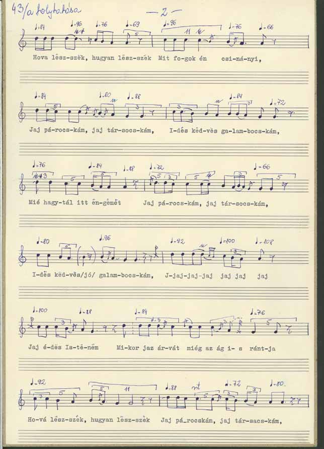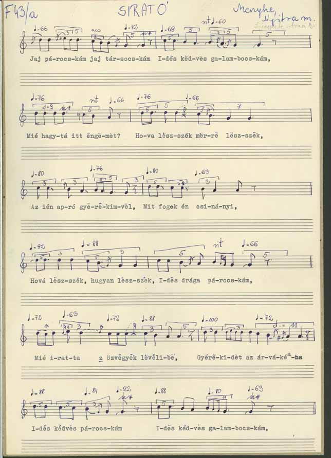 Jaj párocskám, jaj társocskám, édes kedves galambocskám ... Mér hagytál itt engemet... hova leszek , merre leszek az ilyen apró gyerekimvel ... Mit fogok én csinányi hova leszek hogyan leszek édes drága párocskám .. Mie írattad özvegyek levelibe gyerekidet az árvákéba... édes kedves párocskám édes kedves galambocskám ... Hova leszek hogyan leszek ... mit fogok én csinányi ... Jaj párocskám, jaj társocskám, édes kedves galambocskám.. mér hagytál itt engemet ... Jaj párocskám, jaj társocskám, édes kedves jó galambocskám ... Jaj, jaj, jaj... Jaj, jaj, jaj, jaj édes Istenem... mikor az árvát még az ág is rántja ... hova leszek hogyan leszek ... Jaj párocskám, jaj társocskám honnét foglak várni uccától kert megöl ... Jaj párocskám, jaj társocskám .. legalább csak egy holnapba egyszer beszéljek még veled, vagy legalább esztendőbe egyszer ... Jaj párocskám, jaj társocskám, mit fogok én csináni... Hova leszek , hogyan leszek az én gyerekimvel ... Jaj párocskám, jaj társocskám mié hagytál itt engemet özvegységbe, gyerekidet árvaságre ... miko az árvát még az ág is rántja ... Jaj fiacskám, jaj párocskám hova leszek , hogyan leszek, hogyan fogok dógozni ... ha téged nem foglak látni, Hogyan fogok e temető mellett elmenni... ... Jaj párocskám, jaj társocskám, édes kedves galambocskám.